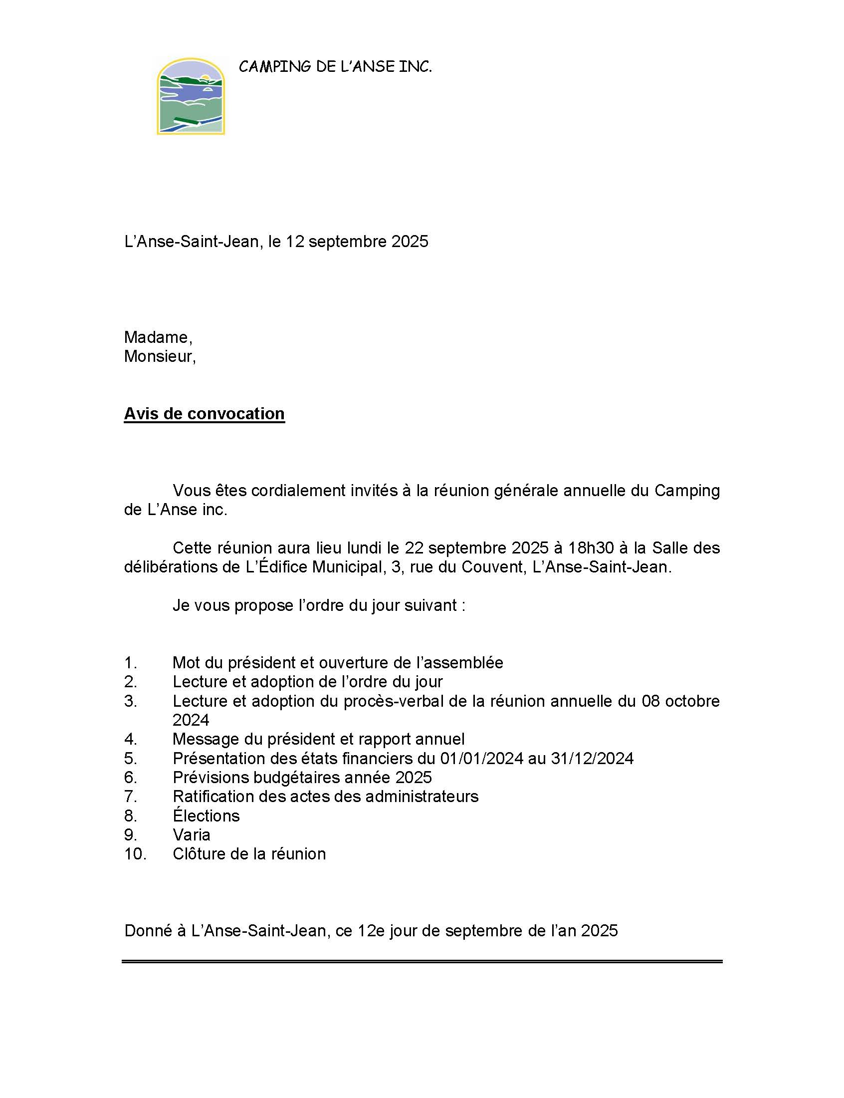 Avis de convocation assemblée générale annuelle du camping de l’anse
